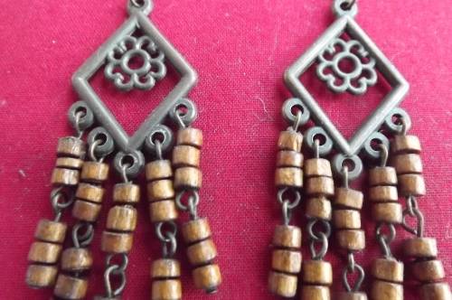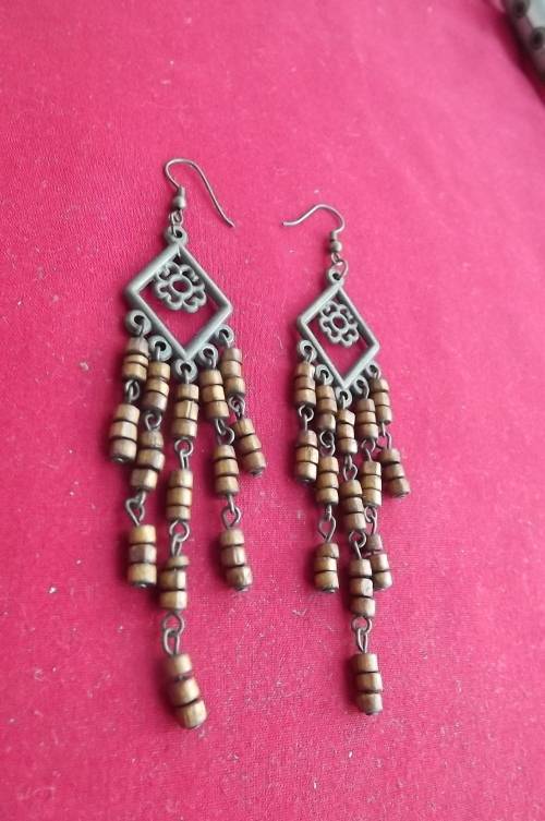 Pair of ethnic brown wooden bead dangling earrings for pierced ears.As new