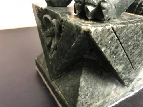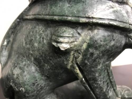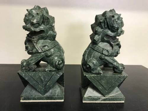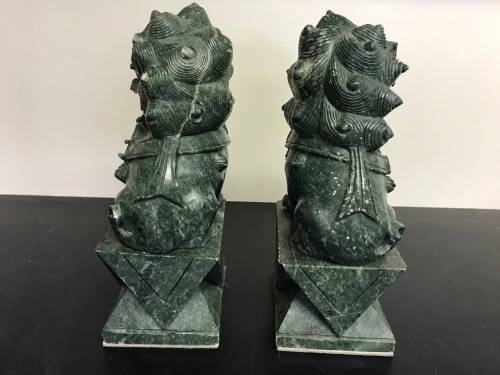 Lovely pair of solid green marble foo dogs. They have a few small chips as shown in pictures and some white spots on marble but overall good condiition. Please ask if unsure about anything to prevent misunderstandings. Photos form part of the description. These weigh in at 8 kg each. size is 11 cm wide and 16 cm long and 33 cm high. they are in 2 pieces top and bottom. Postage will be R200-00. normal post and 3% of value extra for insured post.I cannot be held responsible for loss or damage in transit. Payment within 48 h after closure of auction please. I mail once a week on Friday mornings . Speedy payments ensure speedy delivery.