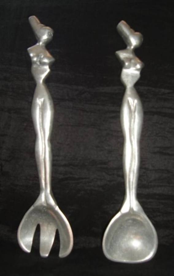A LOVELY PAIR OF METAL SALAD TONGS WITH NUDE FIGURE HANDLES, height 27.5cm each, total weight 323gsm.