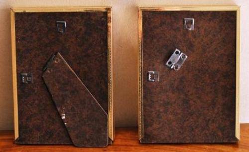 Pair of photo frames. They measure about 21 cm by 16 cm. They are in good condition, but yhe one has lost the stand in the back. They do have glass in front.