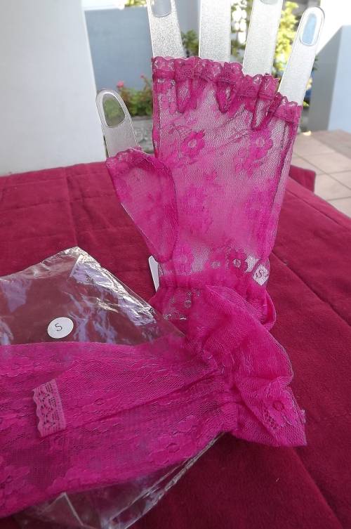 Pair of pink special occasion half fingers gloves.Size small.In nylon lace fabric