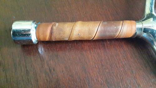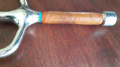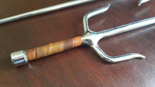 A pair of Solid Martial Arts Sai Octagon steel/chrome daggers with Brown leather wrapped handles.