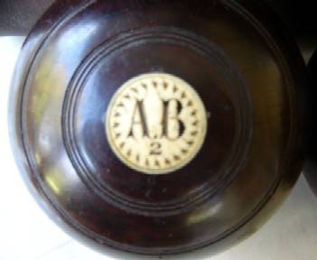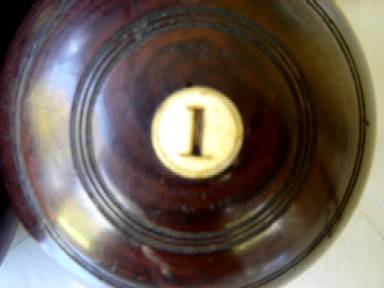 These bowls are from an era when bowls were permitted to have various biases. The are only two of them, and they are in a very good condition. The grain of the wood from which they are made is visible. I think that they were actually used in Crown Bowls, a for of Lawn Bowls played in the UK.