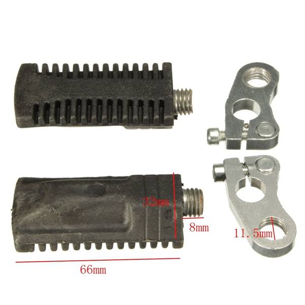 This is the adjustable clamp. Perfect replacement for your old or worn foot pegs. Fits most of Chinese mini motor, clamps included. Fitment: Suitable for 47cc 49cc Mini Motor, Pocket bike. Specification: Color: Black Quantity: pair Material: alloy with rubber rests Fixing Hole Diameter: 11.5mm Length: 66mm. Width: 32mm. Thickness: 17mm