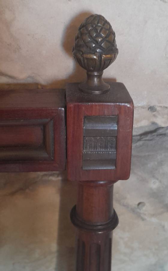 A fine pair of Victorian mahogany Louis XVI style side chairs. Fluted legs and back slats with metal acorn finials. Superbly upholstered in quality fabric with "piper" motif. Excellent condition. Collection in Gordons Bay, Cape Town.