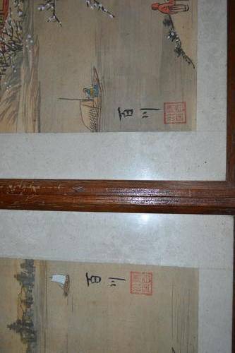 PAIR WOODEN FRAMED JAPANESE SILK PAINTINGS SIGNED