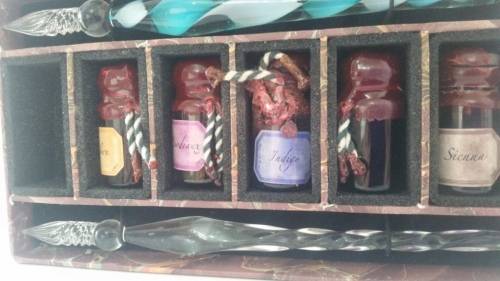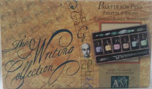 This Victorian Era replica writing set is not only to write letters, but to finish a page in a diary or letter with a personal illustrative vignette. The Palette For Pens Writing Set provides a great value with 2 glass dip pens and 6 bottles of dipping ink. Please see photos for condition. one bottle missing