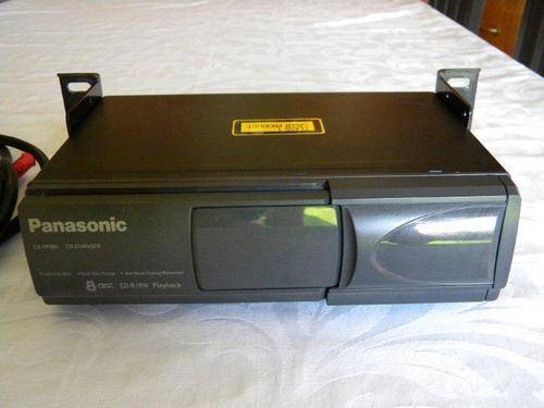 PANASONIC "Ultra Compact 8-Disc CD Changer". Features 8 disc capacity, 1-bit MASH technology, 32 x oversampling noise shaper, digital accu-servo tracking, anti-shock floating mechanism, separate digital/analog power supply, quick disc change time, 5 step variable angle mounting and learning skip.