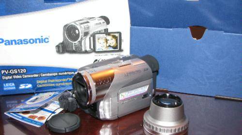 Nice, Great Shape(no rough handling at all!) 3CCD Panasonic PV-GS120 Camcorder with add-on RANOX superwide lens. Camera, Battery, Charger (with plug in power too), Wide Angle Lens, Manual, Simple Case and Original Box.