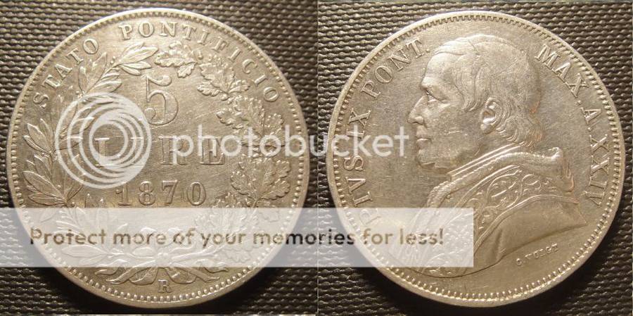 Papal States : Silver CROWN-size 5 Lire of 1870 R (Pope Pius IX)