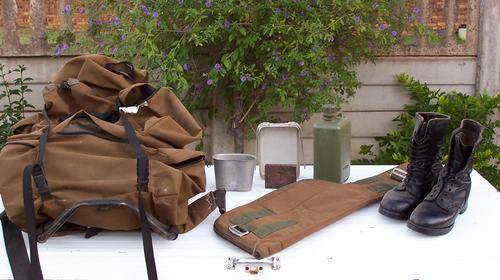 List of Items - Pattern '83 Webbing Pack; Fire Bucket; Dixie; 2 litre Water Bottle; Original Esbit Stove; Black Jump Boots; and Para Rifle (R4/5) Bag. Ex Air Force Task Force.