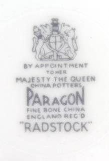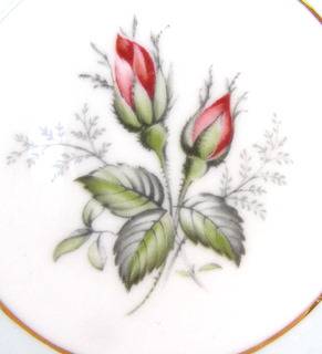 A Paragon bone china teaplate in the Radstock pattern. It depicts a pair of pretty rosebuds in the centre, surrounded by pale blue and a lacy sort of decoration. There is also gold trim on the rim and around the central rose bunch.