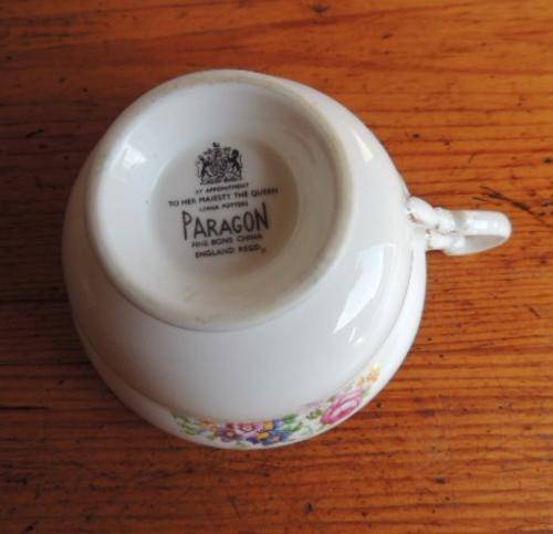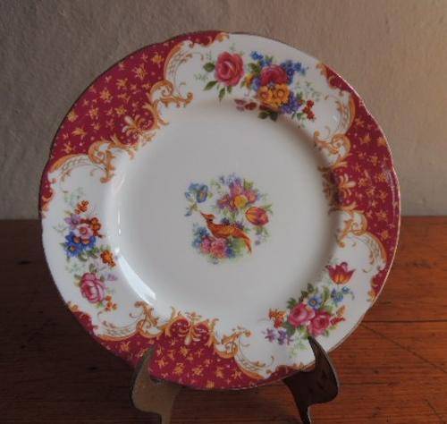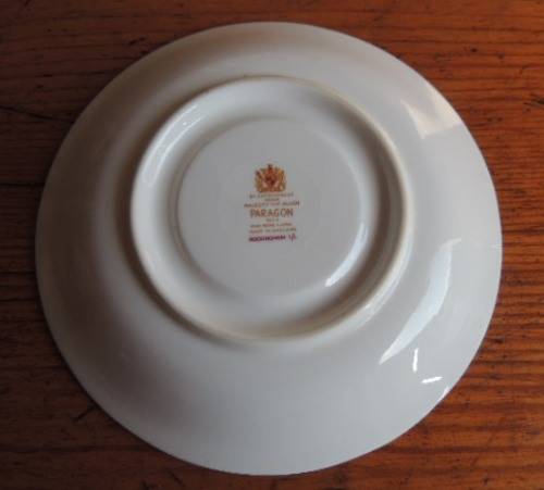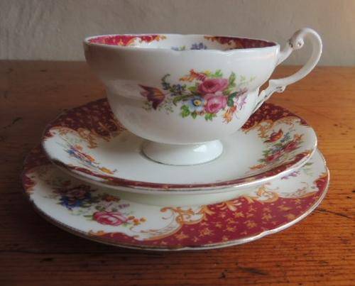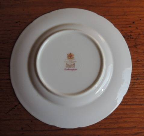 These trios are lovely. The cake plate is marked "Rockingham" and is 16cm in diameter. The saucer is marked "Rockingham" and is 14cm in diameter. The cup is not named and is 9.5cm in diameter and 6cm deep. The condition is not perfect, but there are no chips or cracks at all - just gilt loss.