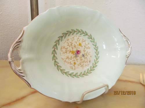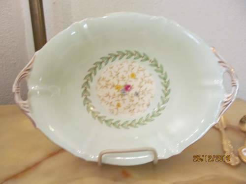 THIS ITEM IS THE PASTEL GREEN VERSION. A VINTAGE FINE PORCELAIN PRESENTATION TRAY WITH FLUTED VERGES AND GOLD TRIM ALONG THE MILDLY SCALLOPED RIM. A PAIR OF SCROLL HANDLES ALSO DECORATED IN GOLD HAVE BEEN CREATED ON THE SIDES.