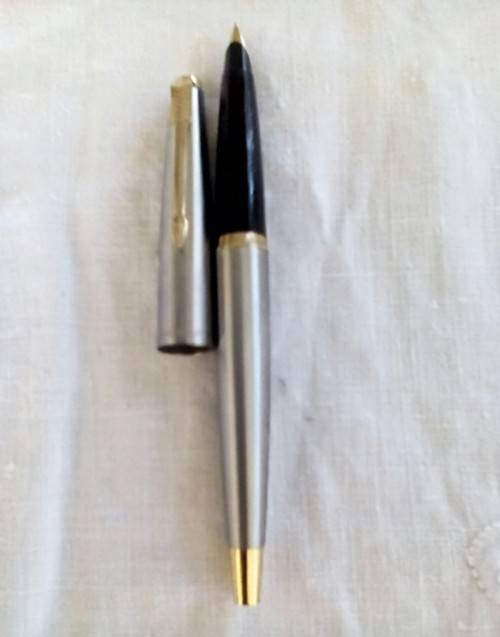 Parker 45 Flighter fountain pen. Stainless steel finish with gold plated trim. Measures 135mm in length. Cap marked Parker and Made in England. Arrow clip. In good condition.
