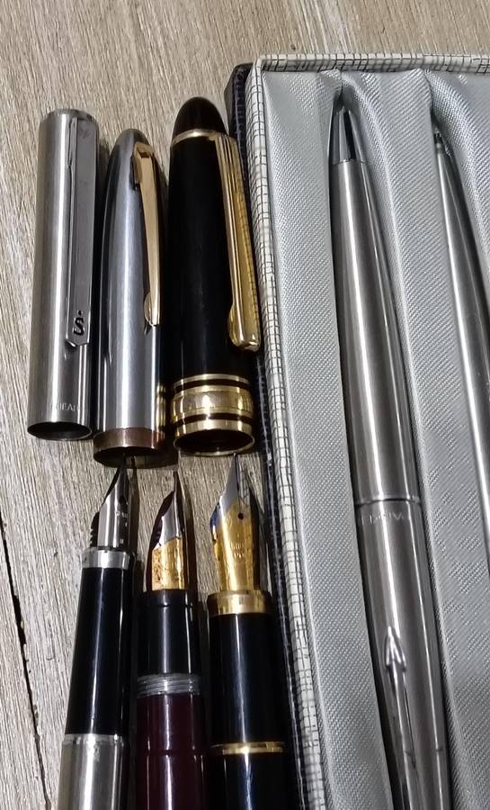 THERE ARE FOUR FOUNTAIN PENS, ONE BALL POINT PEN, AND ONE CLUTCH PENCIL IN THIS LOT.