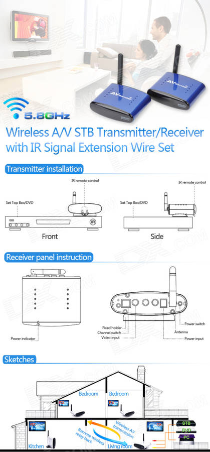 The product consists of a transmitter and receiver for promotion. It adopts an advanced 5.8GHz wireless transmission scheme and has the advantages of a long transmission range, strong anti-interference and high mobility. It can transmit AV signals of DVD, DVR, CCD camera, IPTV, satellite STB, digital TV STB and other similar devices, by means of radio waves and receive them at distant end and input them to a TV set to be displayed. It enables you to easily realize wireless sharing of HD AV data and enjoy untrammeled hi-fi audio and visual effects.