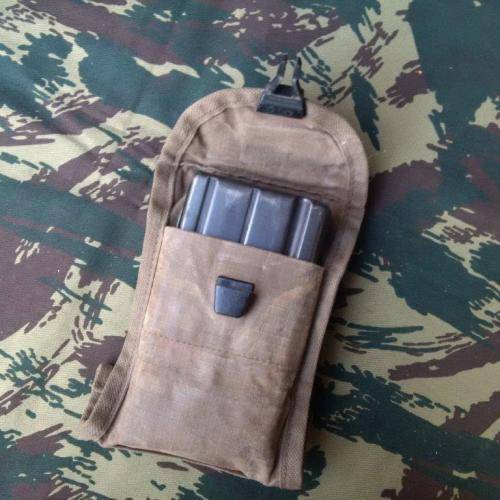 There are 3 diff closures found on the patt 80 mag pouches - this is the "fixlock" type (Swedish supplied) similar to the clips used on the SA SF (Recce) Niemoller webbing.