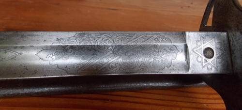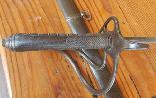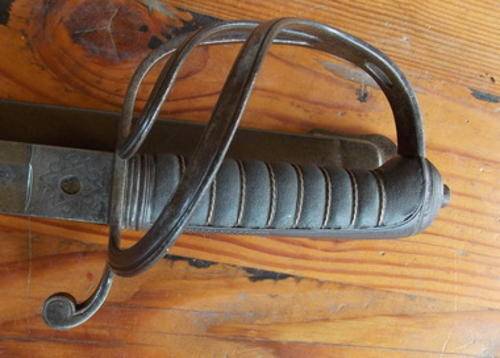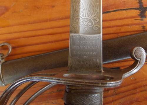 Pattern 1892 British Officers Sword. In fair condition. Some light pitting on scabbard and hilt. Etching on blade still crisp. Made by Hobson and Sons of Little Windmill St. London. Some blemishes on blade.