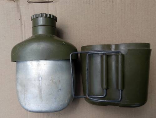 1 liter Aluminum bottle with green plastic cap & 2 piece green plastic covering. Green plastic cup with heavy gauge aluminum wire handles. Bilingual DON'T HEAT warning around the neck. Some scratches in plastic & wear and dents on metal. Makers name inside the bottom of plastic drinking cup W1616, Blankfield Ind, RSA, SA Defense Force M inside U molded into bottom of plastic cup. Pattern 61/64 gear was used by the SADF and then was passed on to the Rhodesian Army when they adopted the newer Pattern70 webbing. Fair condition as per pictures. Images are of the actual item/s on offer.