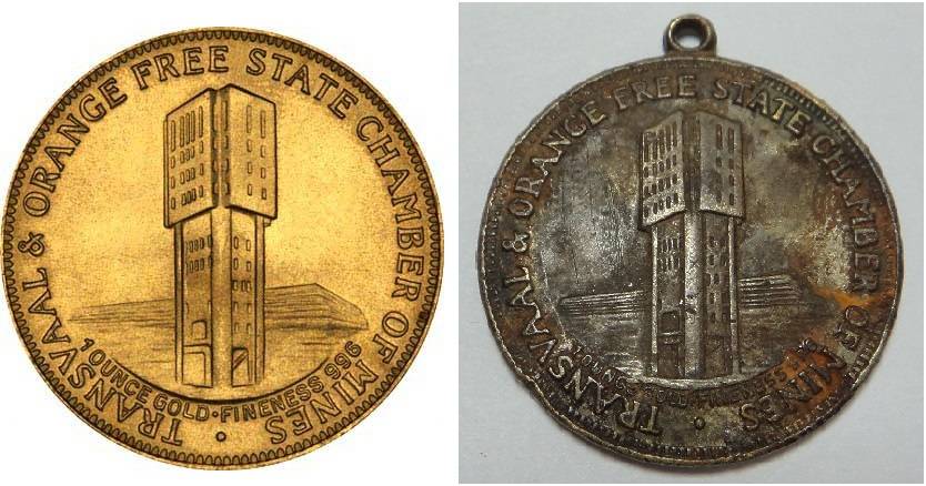 In 1960, the Chamber of Mines struck a 1 ounce gold medallion that many regard as the forerunner of the Krugerrand. The obverse of this copper or bronze medallion is an exact replica. The reverse reads "Westfalia Dunen".