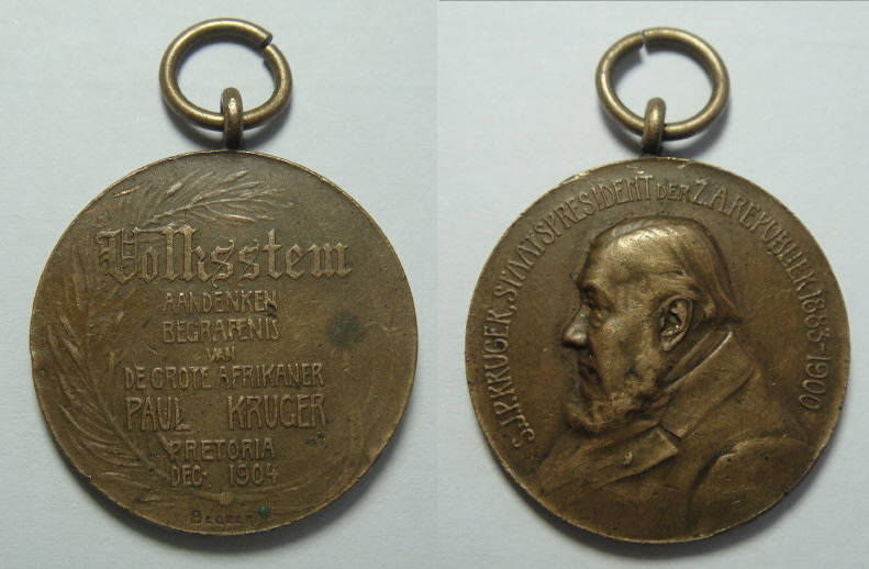 Laidlaw writes “Following his death in July 1904, Kruger’s body remained in Holland for four month before being transported back to South Africa aboard the ship S.S. Batavier IV. He was finally laid to rest next to his wife in the Pretoria Cemetery on 16th December 1904, Dingaans Day. The Pretoria newspaper, De Volksstem (the voice of the people), distributed this medal to commemorate the funeral”.