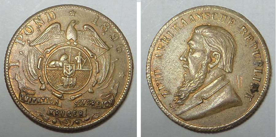 According to Professor Michael Laidlaw's southafricanmedals.com, the imitation Ponde were used as gaming counters from 1896 onwards. There are 13 known varieties of the 1 Pond imitation. Paul Withers (2002) has numbered these 2-14 (1 being for the ½ Pond). The varieties have been made from combinations of 10 different obverse die types and 8 different reverse die types. The differences are sometimes minor.