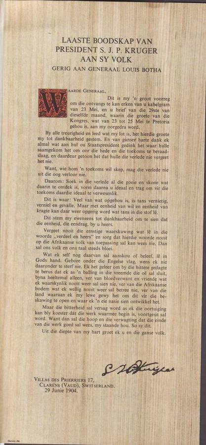 This item is in a pamphlet form with a copy of the actual message made on 29 June 1904 in Switzerland by Paul Kruger.