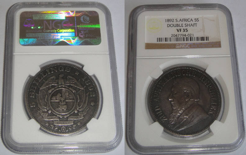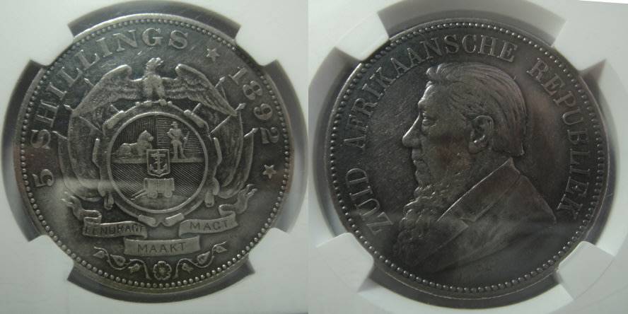 Paul Kruger ZAR: Five Shillings (Double Shaft Crown) of 1892: NGC graded VF 35