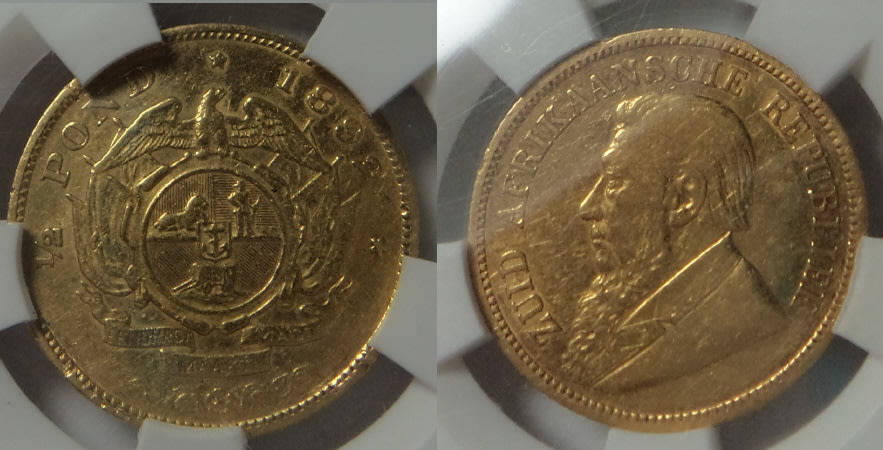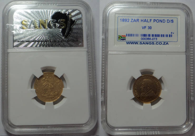 Paul Kruger ZAR: GOLD Half Pond 1892 (Double Shaft) Sangs graded VF 30