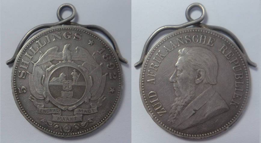 Paul Kruger ZAR: Trench / P.O.W. Art (Pendent): Five-Shillings (5/- Single Shaft) of 1892