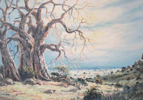 A stunning painting by Paul Potgieter, the lone Baobab tree in a landscape is outstanding! The painting measures 49cm x 34cm and the frame measures 61cm x 46cm. Bid now!!
