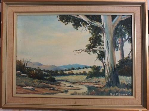 PAUL POTGIETER Acclaimed South African Artist - Lowveld Scene - Blue Gum Tree next to Stream - Oil on Board Signed by the artist