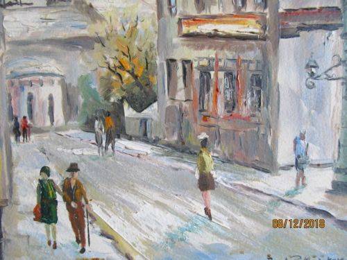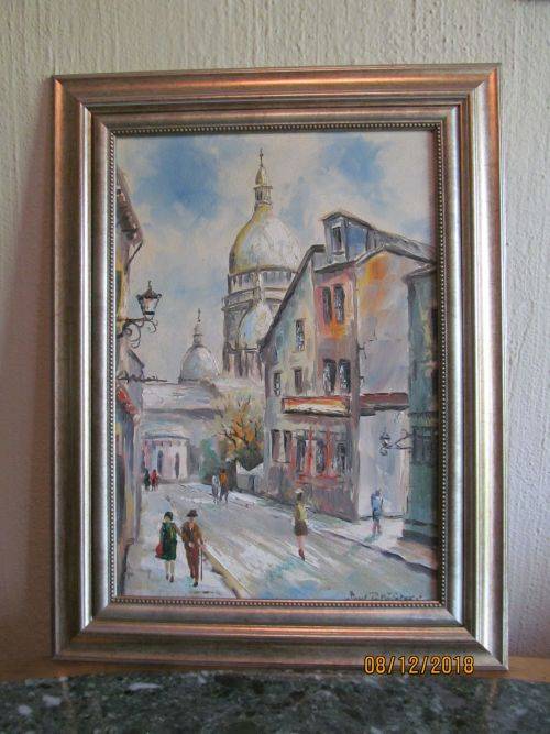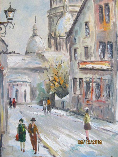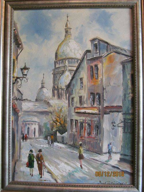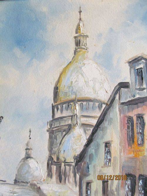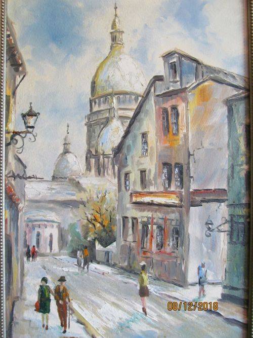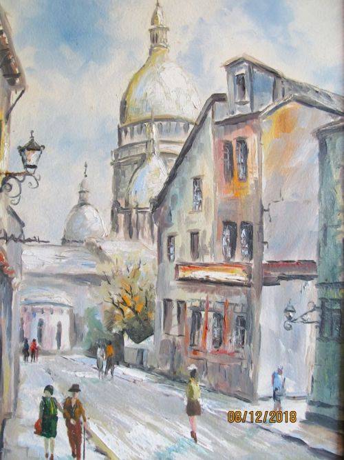 THIS LOVELY PAINTING BY THE ARTIST DEPICTS A PERSPECTIVE CITY SCENE OF A PARIS MONTMARTRE STREET WITH THE PEOPLE PORTRAYED IN THE DRESS STYLE OF THE ERA WHICH APPEARS TO BE 1960-1970's MANNER. THE LIGHT AND CALMING NATURE OF THE SCENE PERMITS THE VIEWER TO FOCUS ON THE STRUCTURES BUILT ALONGSIDE THE ROADWAY AS WELL AS THE TALL AND PROMINENT SPIRES AND DOMES OF THE BASILICA DOMINATING THE SKYLINE BENEATH A SOFT BLUE SKY WHICH IS INFUSED WITH THE GATHERING OF CLOUDS