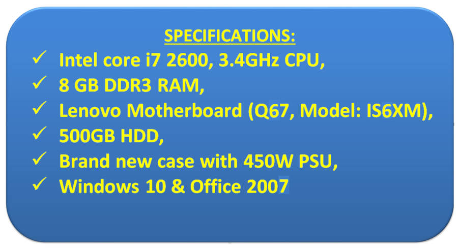 PC with:Intel Core i7-2600 3.4GHz CPU, 8GB RAM, 500GB HDD