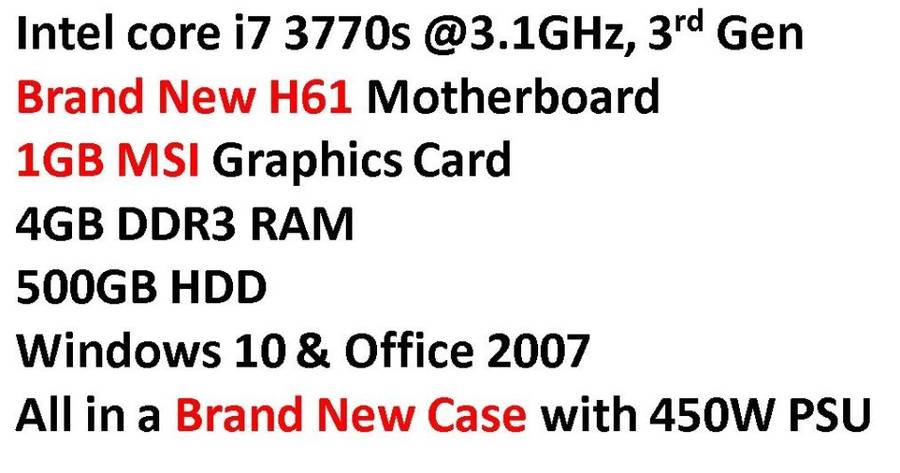 PC WITH: INTEL CORE I7 3770S @3.1GHz, 500GB HDD, 4GB RAM, 1GB GPU