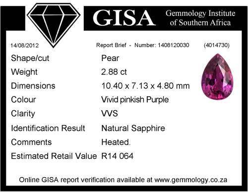 Pear shaped purple Sapphire 2.88 Carat - Retail value of R14064 - Certified by GISA