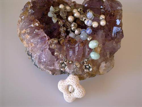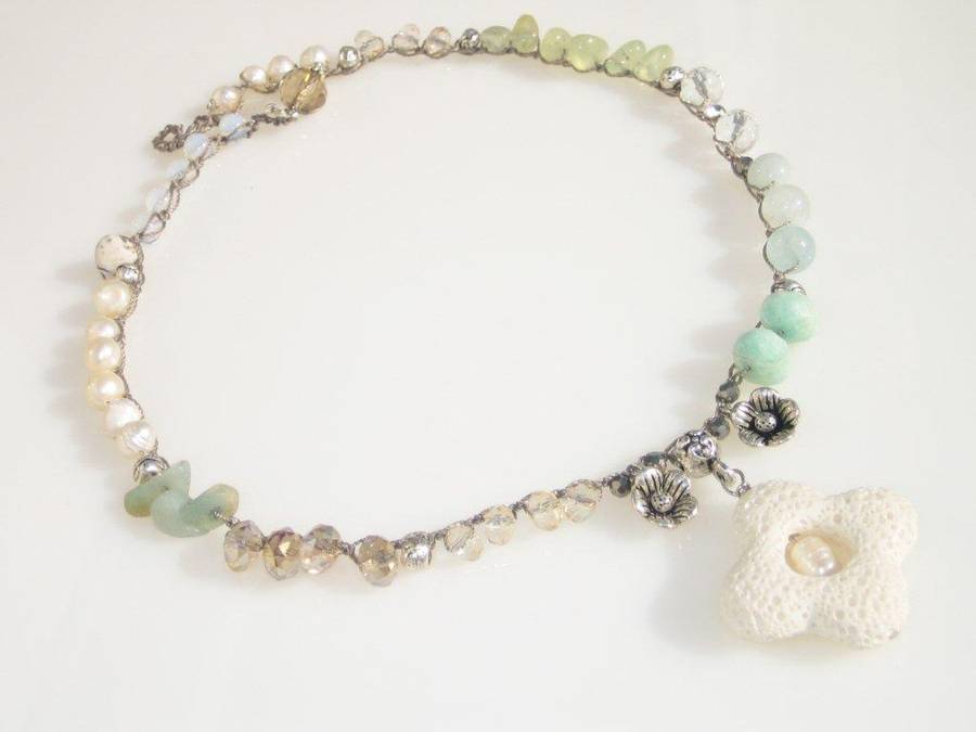 A one-of-a-kind handmade crochet necklace with freshwater pearls, phrenite, amazonite, aquamarine, opalite, and crystal beads.