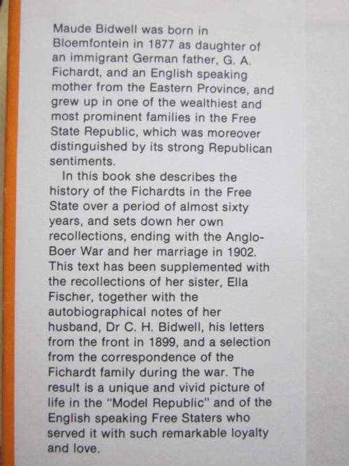 Maude Bidwell (born Fichardt) describes the history of the Fichardts in the Free State over a period of almost 60 years, and sets down her own reflections, ending with the Anglo-Boer War and her marriage in 1902.