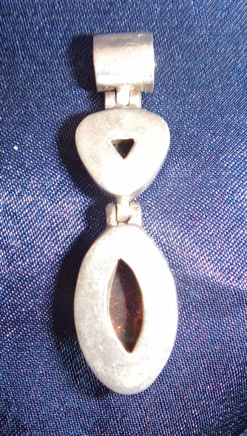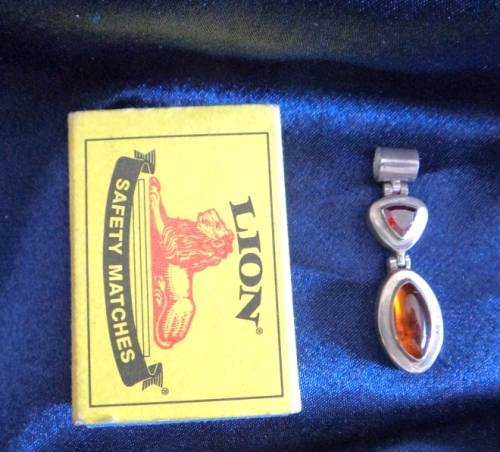 The pendant, with the Garnet at the top and the Amber set in the bottom part of the pendant, is in a good condition.