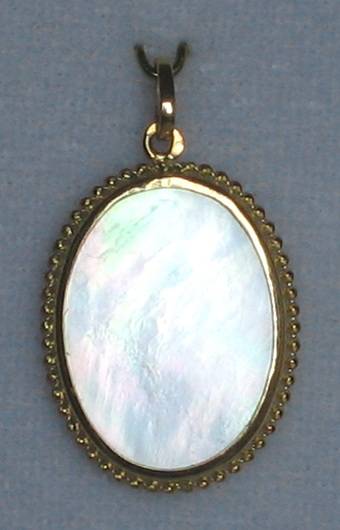 Oval mother of pearl pendant on a fancy, engraved frame, with a twisted rope surround.