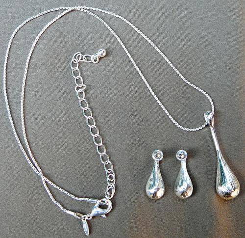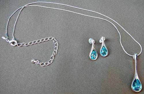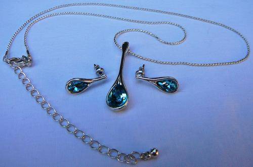 This beautiful three piece set made by Avon consists of a Blue Glass Stone Pendant set in a silver coloured metal on a silver coloured chain, and a pair of drop earrings with smaller blue glass stones. The Pendant is 38 mm long, the Pendant Stone is 12 mm x 10 mm, the chain is 400 mm long. The earrings are 20 mm long.