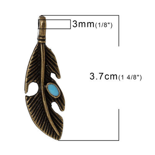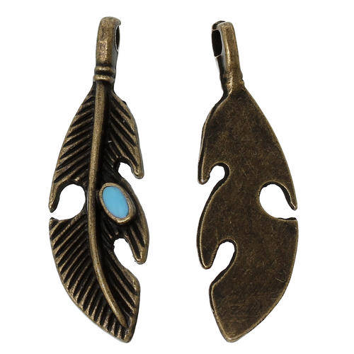 PENDANTS - ANTIQUE BRONZE AND BLUE ENAMEL - FEATHER - CHARMS - 37x12mm