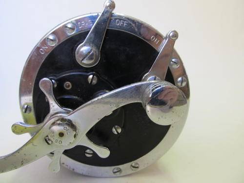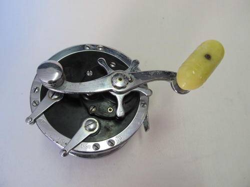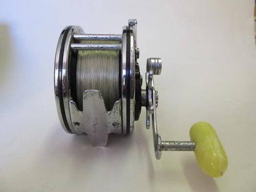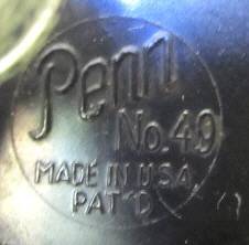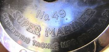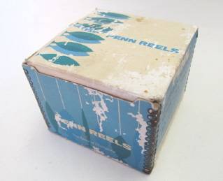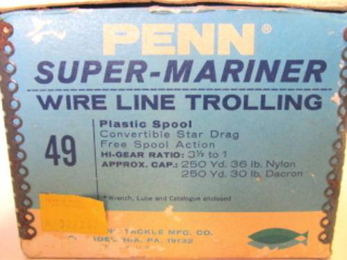 A Penn 49 Super-Mariner fishing reel in its original box with two Penn spanners. Specifications: plastic spool; convertible star drag; free spool action; hi-gear ratio 3.5 to 1; approx. cap. 250 yard 36 lb Nylon, 250 yard 30 lb Dacron. I'm not a fisherman so haven't tested it, but it appears to be in good working order. The box is sturdy but has been enjoyed by many fishmoths!