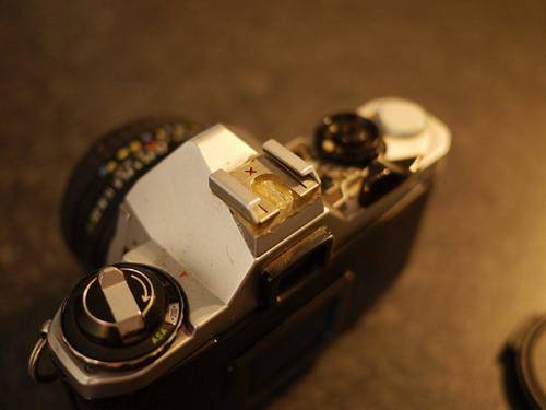 There are some scratches on the body and the flash shoe seems to be held on with a hard resin