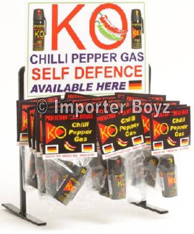 Full stocked pepper spray stand with 30x KO Jet or Fog packaged 50ml cans.