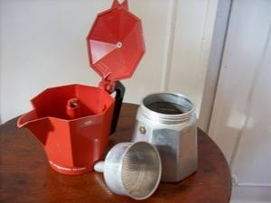 Coffee percolater. This percolater is marked made in Italy Clor Express per alimenti , it is in good condition and measures 170mm high. The inside of the lid is marked Crusinello made in Italy A B C and C2 AB. The upper section of this pot is reddish brown.