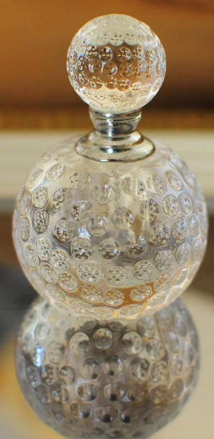 A brand-new perfume glass with crystal screw on cap with real glass dabber in stunning gift packaging. The perfume glass bottle is 9cm tall and 4cm wide with lid.