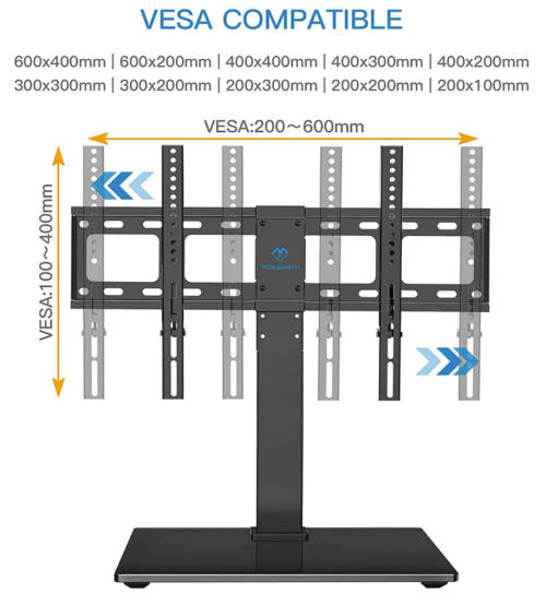 This VESA TV stand securely holds 88lbs and wont tip over or fall down.Durable, high-quality steel construction ensures increased safety. Black tempered glass base adds a nice, sleek appearance to your home