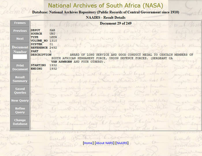 There is a mention of this medal being awarded to Sergeant Van Aswegen in 1932 in the SA National Archives.